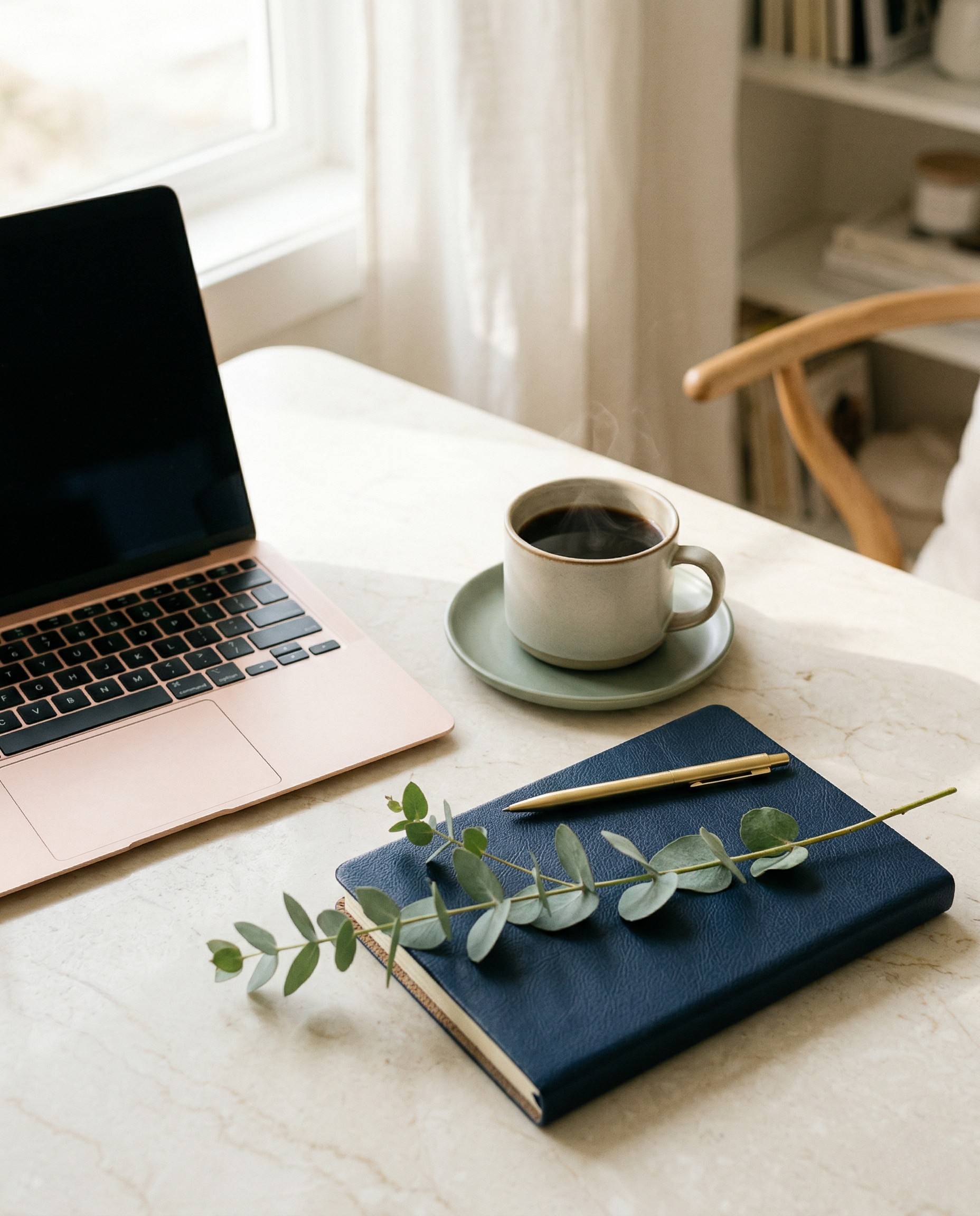 Hands exchanging a navy linen notebook over a marble table — representing the careful handoff of a vetted EA
